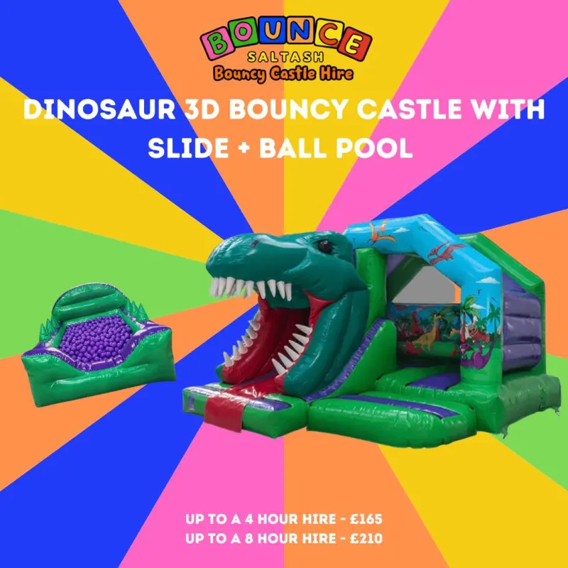 Book your 3D Dinosaur Bouncy Castle with Slide & Ball Pool Package today with Bounce Saltash Inflatable Play and Party and let the dino-sized fun begin!